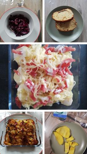 Mon petit déj et mon déjeuner de samedi Pour Le dîner j'ai mangé chou rouge avec vinaigrette allégée Du taboulé car je n'ai pas pris mes 150g de féculents du midi. 100g de skyr avec 1/2 mangue |
